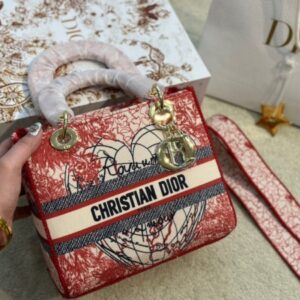 DIOR MEDIUM LADY D LITE BAG RED AND WHITE D ROYAUME D’AMOUR EMBROIDERY 24CM