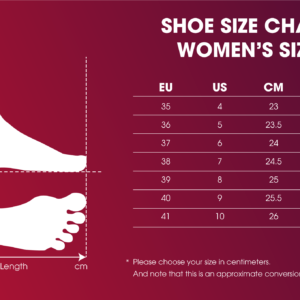 Size Shoes | 35 EU – 4 US – 23 Cm – 9 In., 36 EU – 5 US – 23.5 Cm – 9.2 In., 37 EU – 6 US – 24 Cm – 9.4 In., 38 EU – 7 Us – 24.5 Cm – 9.46 In., 39 EU – 8 US – 25 Cm – 9.8 In., 40 EU – 9 US – 25.5 Cm – 10 In. |
