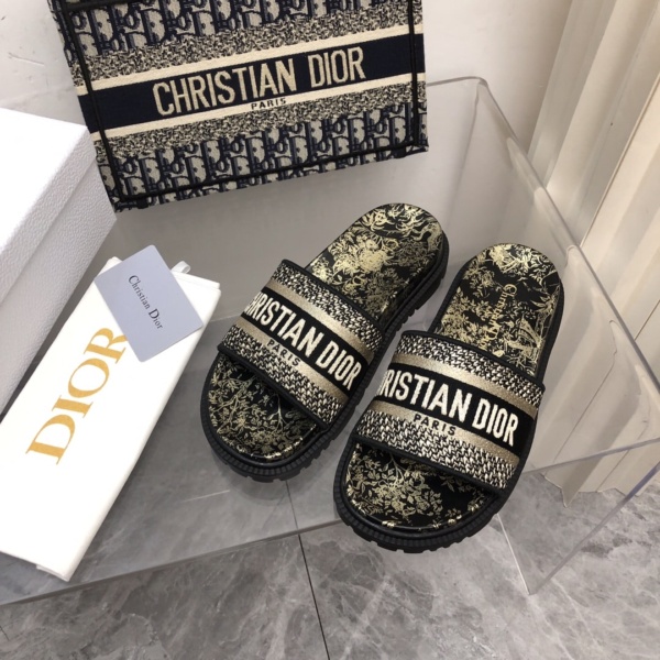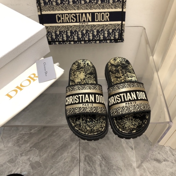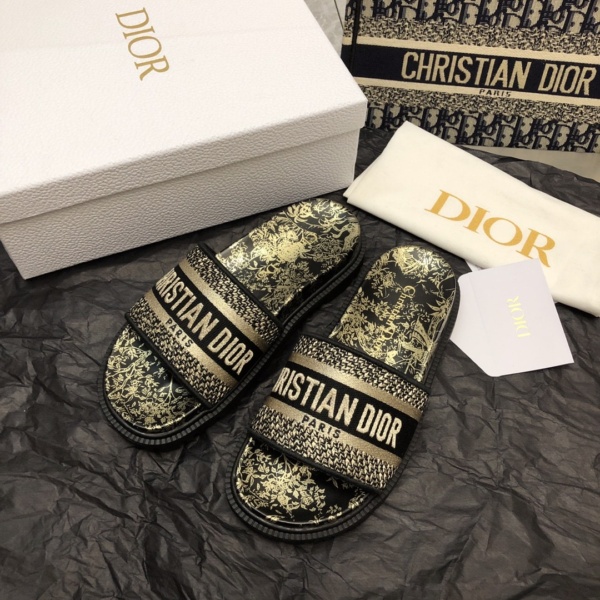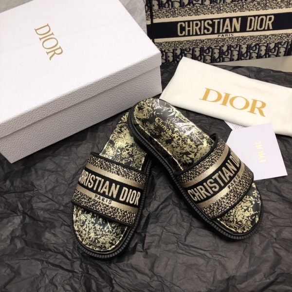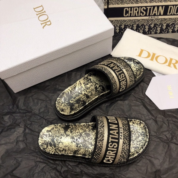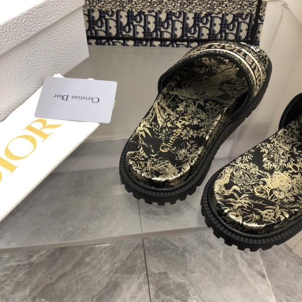 DIOR DWAY TOILE DE JOUY EMBROIDERED SLIPPER BLACK GOLD TONE