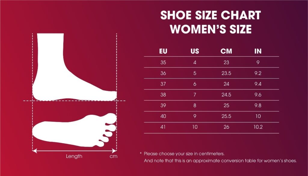 Size Shoes | 35 EU – 4 US – 23 Cm – 9 In., 36 EU – 5 US – 23.5 Cm – 9.2 In., 37 EU – 6 US – 24 Cm – 9.4 In., 38 EU – 7 Us – 24.5 Cm – 9.46 In., 39 EU – 8 US – 25 Cm – 9.8 In., 40 EU – 9 US – 25.5 Cm – 10 In. |