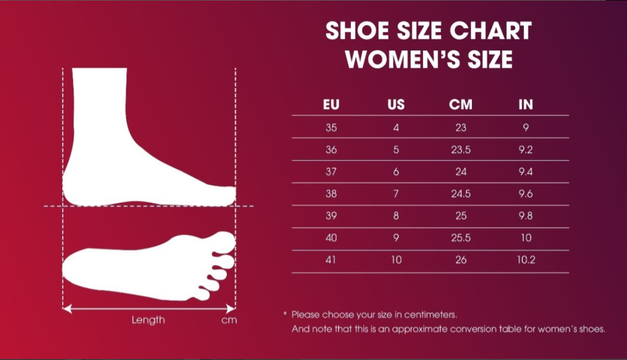 Size Shoes | 35 EU – 4 US – 23 Cm – 9 In., 36 EU – 5 US – 23.5 Cm – 9.2 In., 37 EU – 6 US – 24 Cm – 9.4 In., 38 EU – 7 Us – 24.5 Cm – 9.46 In., 39 EU – 8 US – 25 Cm – 9.8 In., 40 EU – 9 US – 25.5 Cm – 10 In., 41 EU – 10 US – 26 Cm – 10.2 In. |
