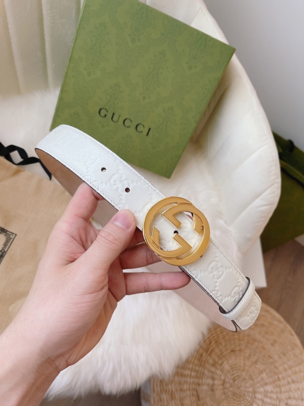 GUCCI CALFSKIN MONOGRAM WHITE BELT GOLD METAL 3.5CM