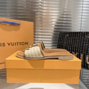 LOUIS VUITTON LOCK IT FLAT RAFFIA MULES BROWN