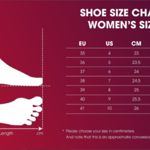Size Shoes | 35 EU – 4 US – 23 Cm – 9 In., 36 EU – 5 US – 23.5 Cm – 9.2 In., 37 EU – 6 US – 24 Cm – 9.4 In., 38 EU – 7 Us – 24.5 Cm – 9.46 In., 39 EU – 8 US – 25 Cm – 9.8 In., 40 EU – 9 US – 25.5 Cm – 10 In., 41 EU – 10 US – 26 Cm – 10.2 In. |